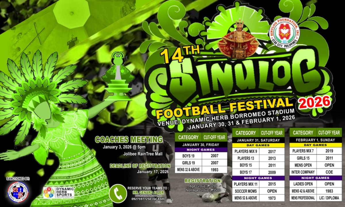 234 teams have signed up for the 14th edition of the Sinulog Football Cup, a three-day tournament that will be played at the Dynamic Herb Stadium and the Paref Springdale football fields.