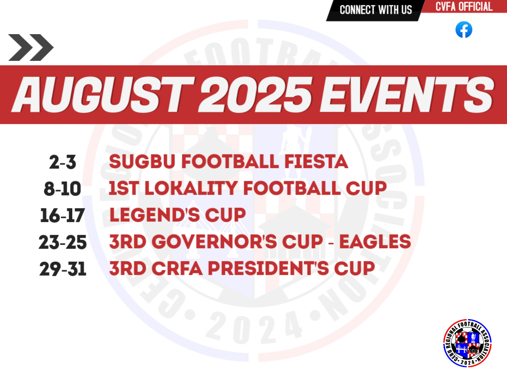 FOR the second straight month, the Cebu Regional Football Association (CRFA) will have a full schedule with five consecutive football tournaments in August.